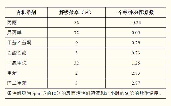 七種有機(jī)溶劑解吸效率表示與圖1。實(shí)驗條件5米升的10%的表面活性劑溶液和60℃24個小時解吸溫度。的有機(jī)溶劑的解吸效率是3%,72%,9%,3%,32%,2%,而對于丙酮,異丙醇,甲基乙基酮,醋酸乙酯,二氯甲烷,甲苯,和3%的米二甲苯。
